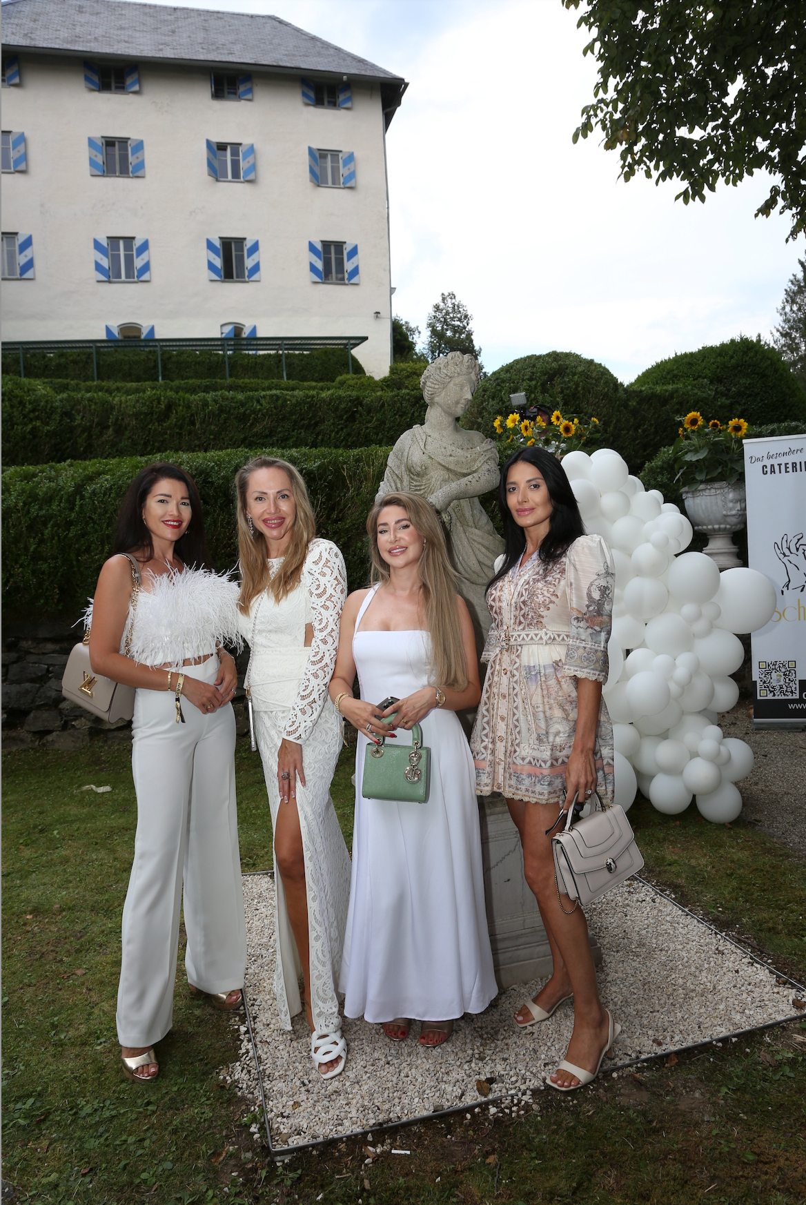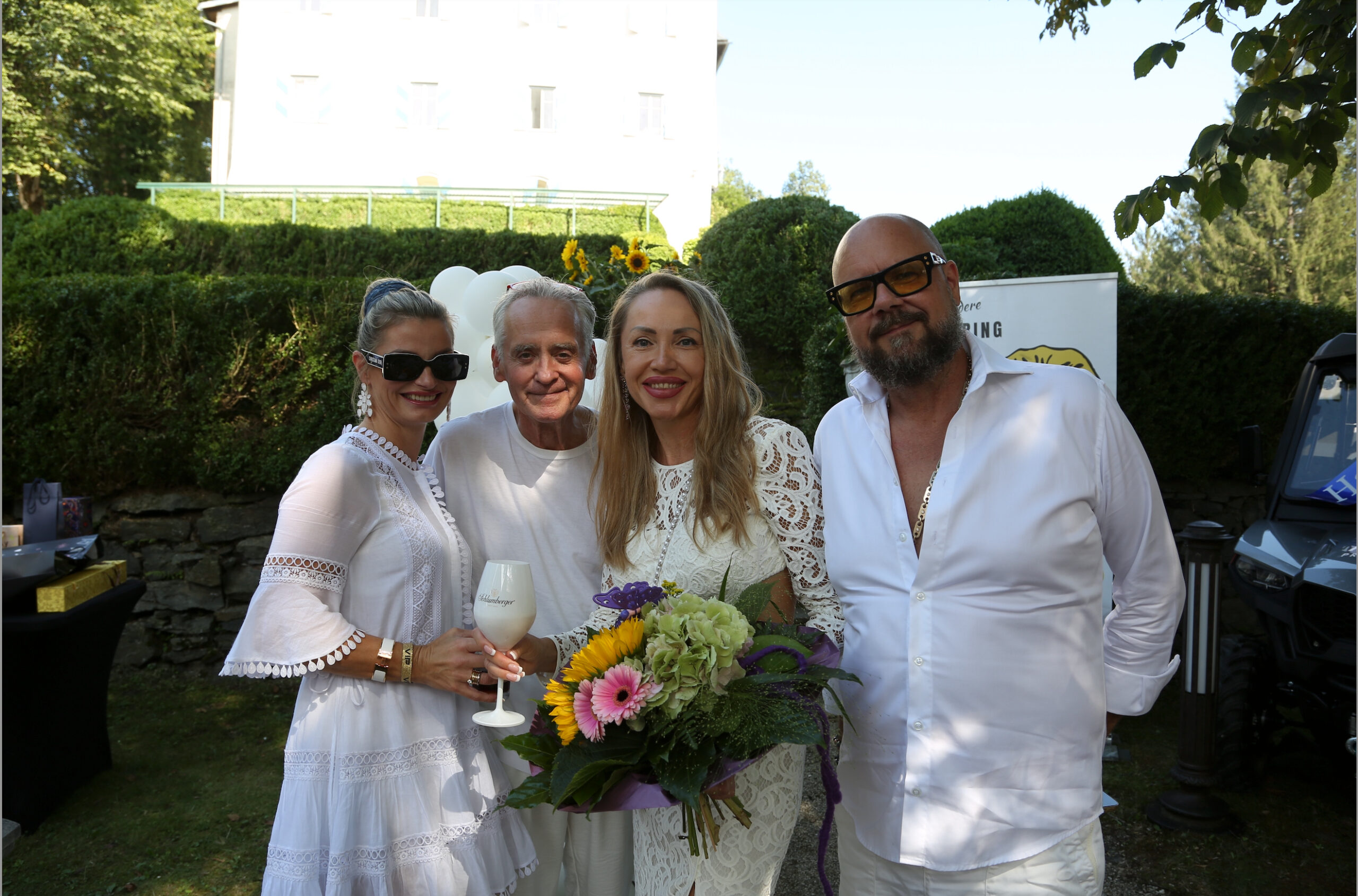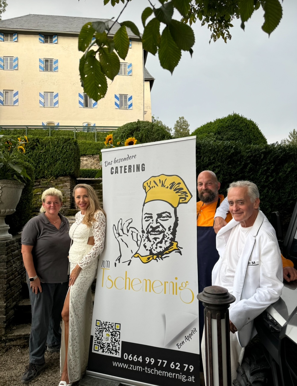 155 Festgäste, die der Überreichung beiwohnten, brachten am 14. 8. Leben in die alten Gemäuer. Unter ihnen der Obmann der Wiener Gastronomie Peter Dobcak, Moderator Oliver Feicht, Security-Unternehmer Martin Fohn (INS-Security), Lakeside-Chef Florian Glatzner, VÖZ-Geschäftsführer Gerald Grünberger, Mercedes Benz-Werbelegende Erich Hammerschmid, Gastronom Poldi Huber, Eventmanager David Kaburek, Mr. Ferrari Heribert Kasper, Springer + Jacoby Austria-Chef Ralf Kober und Natascha Kober (die einen eigenen Song für Mucha komponierten), der Geschäftsführer des Haus des Meeres Hans Köppen und seine Frau Umida, Mauro Maloberti, Mag. Heinz Messinger (AME International GmbH), John Harris Eigentümer Ernst Minar, Elvis Nake, Schönbrunn Group CEO Klaus Panholzer, VGN-Chef DDr. Horst Pirker, Bundesministerin a.D. Maria Rauch-Kallat, die Jacques-Lemans Zampanos Alfred Riedl und Andreas Riedl (der detto am 14.8. Geburtstag feiert), KR Sepp Sintschnig (Ford Sintschnig), Erich Satran, der Maler Raimund Seidl, Kollitsch & Soravia Geschäftsführerin Jasmin Soravia, Kathi Stumpf und Alexander Beza, Emel und David Tschikof, David Wang, Logistikunternehmer Benjamin und Agnes Weindel, Karin Winkler (Tiergarten Herberstein), Veldens Modezampano Christian Woess (der Christian W. Mucha ausstattete) und die Rechtsanwälte Dr. Georg Zanger und Mag. Martin Machold, konnten sich anschließend selbst ein Bild von Muchas Lebenswerk machen. Das Schloss bewundern, das von den Muchas jüngst erneut in wochenlanger Arbeit und mit Hilfe der Gebäudereinigung Brillant (Robert J. Isop) auf Hochglanz gebracht wurde. Oder durch die barocken und englischen Gärten flanieren, die von der Gärtnerei Grohar liebevoll gepflegt werden. Dort erwartete sie eine kulinarische Stärkung vom Catering Tschermenig (Markus Tschemernig). In Kärnten, wie der Hausherr anmerkte, freilich nicht mit Austern, Schnecken und Thunfischtartar, sondern mit wunderbaren Kasnudeln, Ripperln und Hendeln vom Feinsten – sprich: den lokalen Spezialitäten. Erfrischung fanden die Gäste dabei nicht nur im Schatten der Bäume, sondern auch bei Prickelndem von Schlumberger, Soft-Drinks von Coca-Cola und den besten Gewächsen aus dem Hause Morandell.