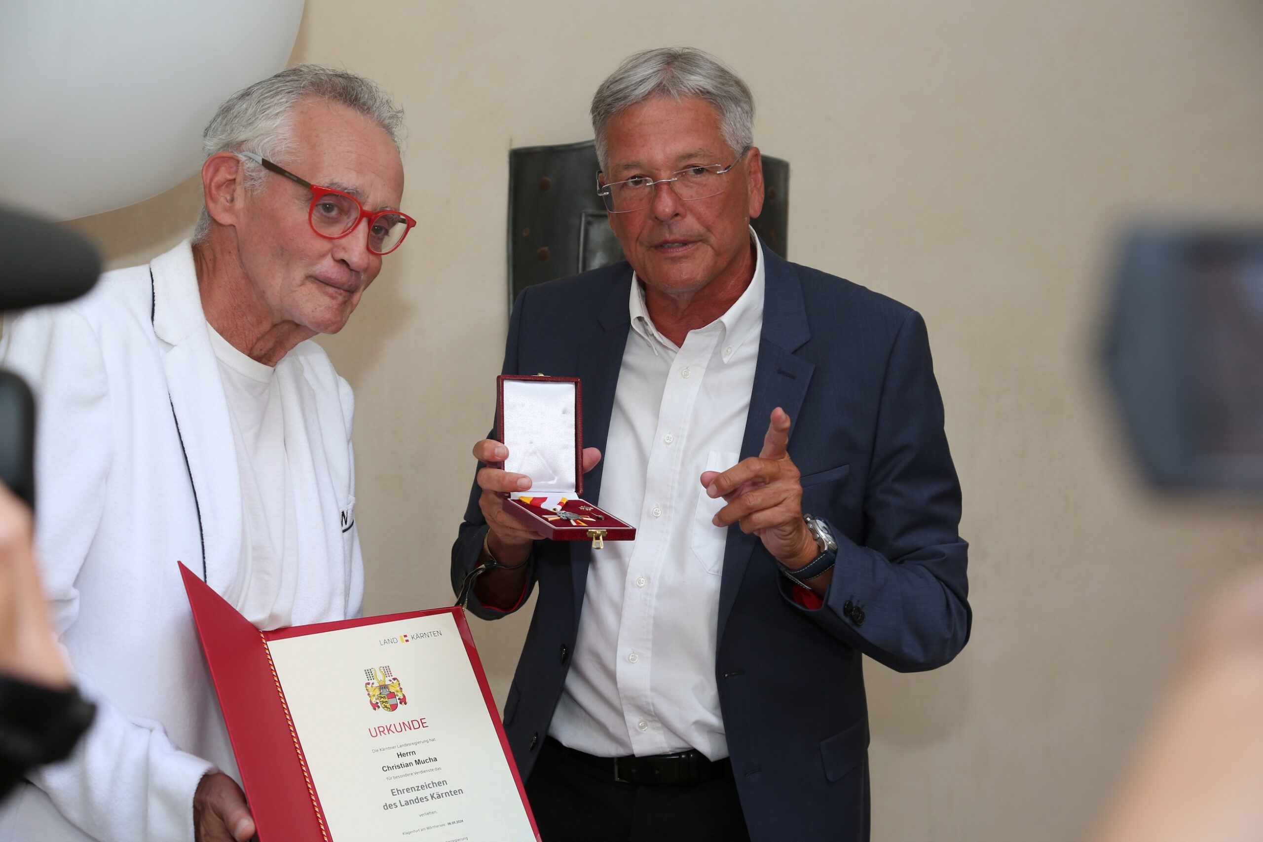 Jetzt bekam der Herausgeber der beiden wichtigsten Touristik-Fachzeitschriften des Landes ein Dankeschön vom Land Kärnten. Landeshauptmann Dr. Peter Kaiser: „In der gewohnten Sparsamkeit des Landes Kärnten habe ich eine nonmonetäre Auszeichnung mitgebracht. Und freue mich, Verleger Christian W. Mucha das Ehrenzeichen des Landes zu verleihen. Christian Mucha hat mit der Sanierung von Schloss Drasing ein Stück Kärntner Kulturerbe für die Nachwelt erhalten. Er hat Kärnten stets als seine Wahlheimat bezeichnet. Er hat für das Land viel Gutes getan und nun ist es Zeit, dass das Land danke sagt.“
