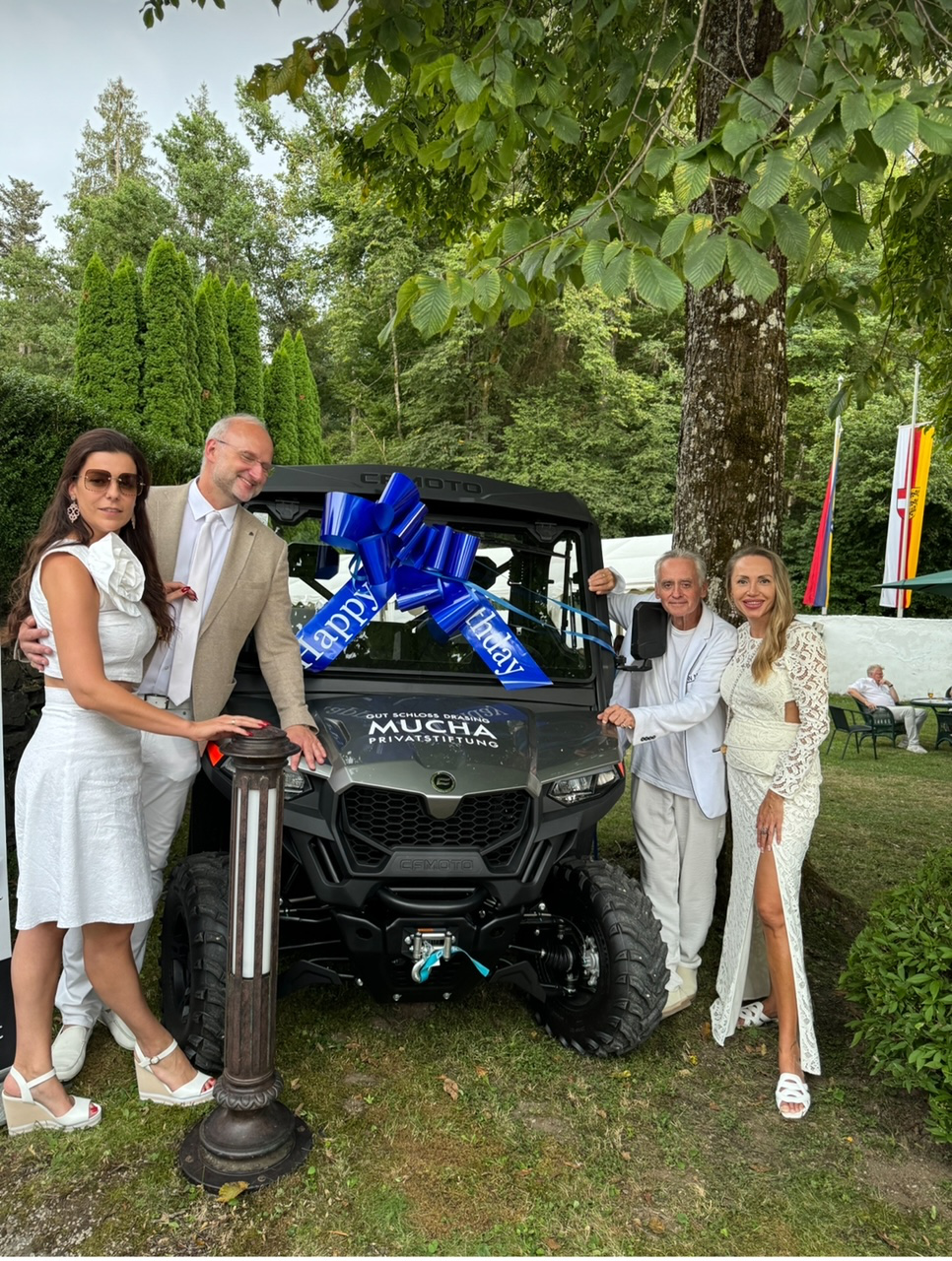 Und etliche stellten sich auch mit unglaublichen Geburtstagsgeschenken ein. Wie etwa Jürgen und Silvana Leeb von Leeb Motor Wolfsberg, die sich mit einem schicken UForce 600 von CFMOTO einstellten. Einem UTV (Utility Terrain Vehicle). Ein Tool mit 41 PS, Servolenkung, Allrad, Seilwinde, kippbarer Ladefläche, Straßenzulassung, und vielem mehr.