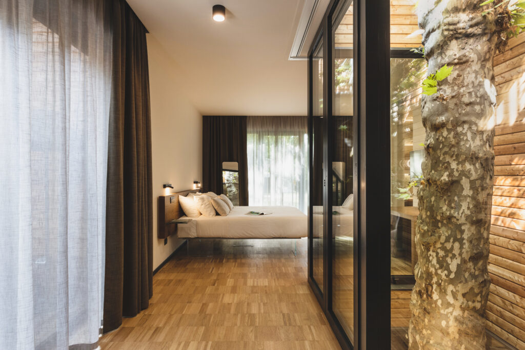Nach eigenen Angaben hatte dabei das von Alberto Apostoli persönlich geleitete Projekt in Montegrotto von Anfang an einen ökologisch und nachhaltig ausgerichteten Charakter. Gemäß dem Projekt-Credo „Platz für die Natur“ sollten sich die Green Lodges sachte als Teil der Landschaft einfügen. So stand es beispielsweise völlig außer Frage, dass jahrhundertealte Bäume auf dem Hotelgelände der Terme Preistoriche für den Bau der Lodges keinesfalls gefällt werden durften. Vielmehr ging es darum, Natur und Architektur harmonisch zu vereinen. „Unser erster Schritt war, die Platzierung der Lodges zu bestimmen und sicherzustellen, dass dies nicht das Fällen der Bäume auf dem Grundstück erforderte“ erklärt der Architekt. „Stattdessen haben wir die Bäume direkt in die Gebäude integriert. Die Lodges sind von der Morphologie des Landes geprägt und aus den Stämmen ‚geschnitzt‘, die von innen durch Glassysteme sichtbar sind.“ Sieben Suiten wurden in hölzerne Pfahlkonstruktionen integriert und durch ein System aus Rampen, Gehwegen und Terrassen verbunden, die in die Landschaft eingebettet sind. Die achte Suite wurde in einer historischen, gut erhaltenen Villa auf dem Gelände realisiert.