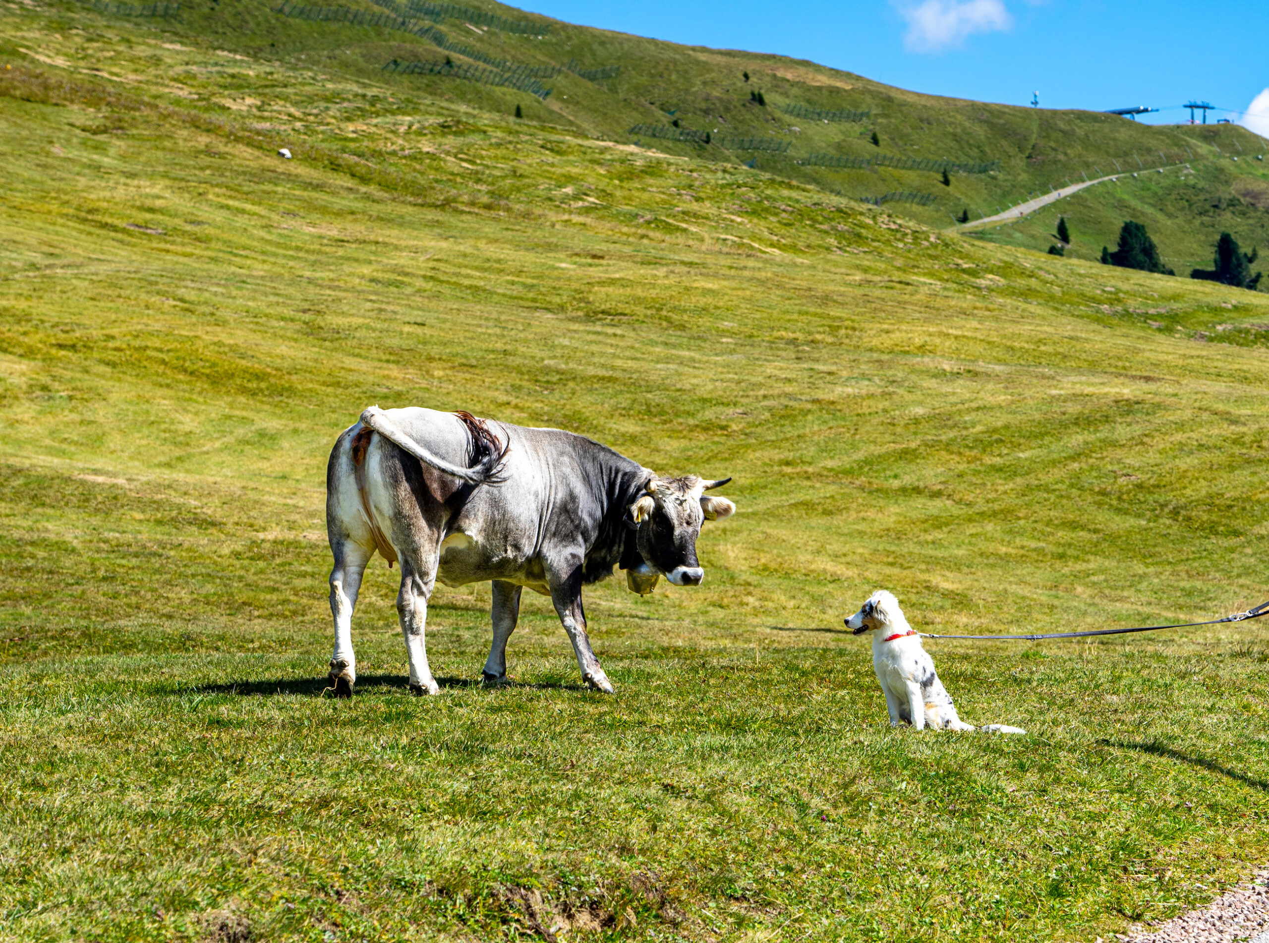 Begegnung von Kuh und Hund auf einer Alm in den Bergen von Südtirol